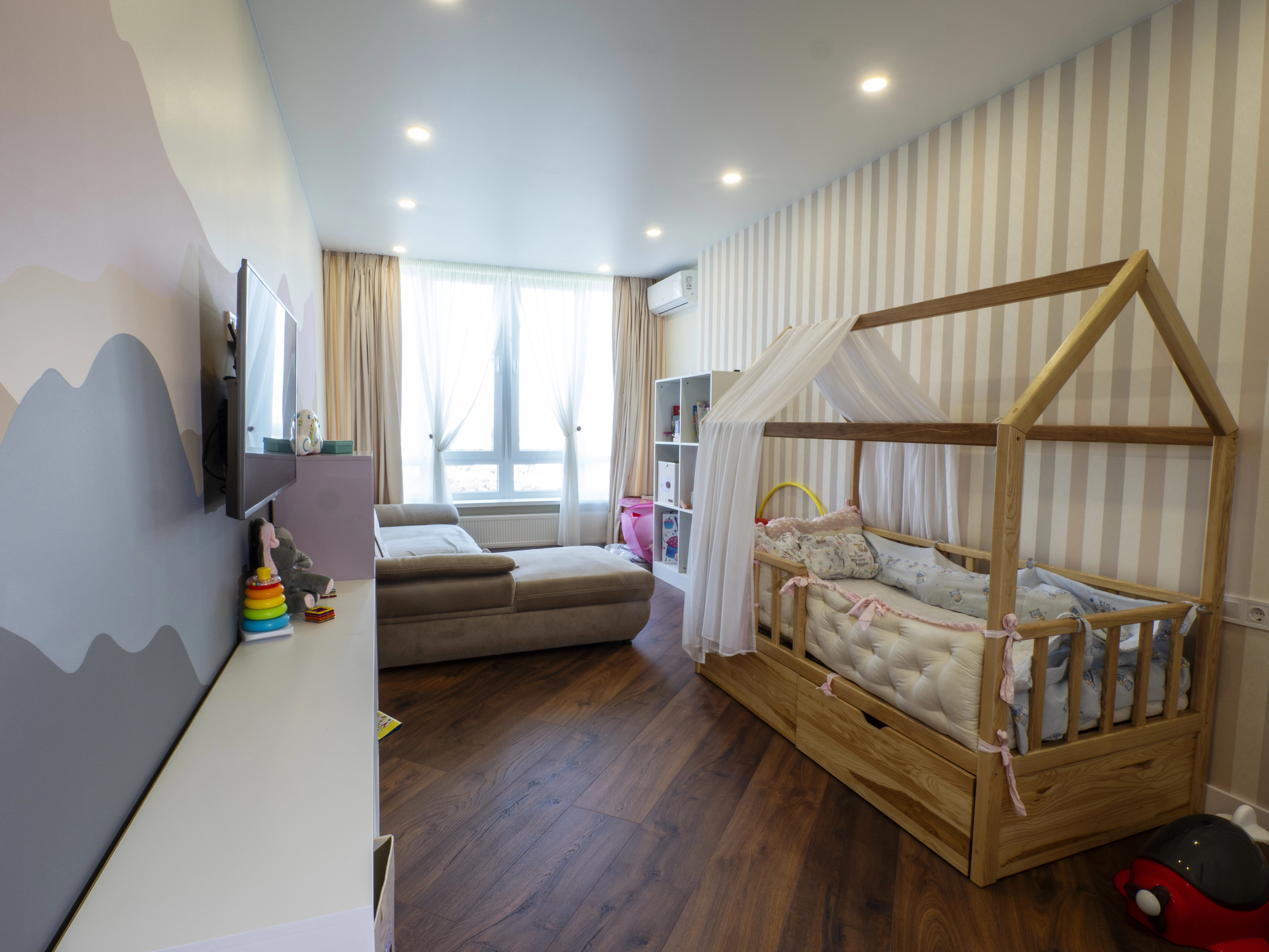 Mix patterns by varying scale and sharing colour. Combine one large, one medium, and one small print — like a mural, stripe, and dot. Limit to two or three patterns per view so the space feels balanced. Test large samples together in room light. Stripes and florals are reliable pairings, especially when grounded by solid textures.