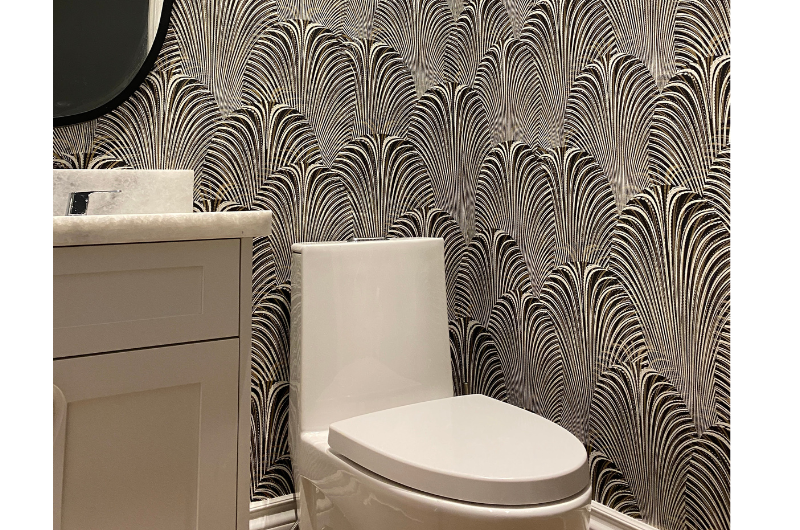 Waterproof wallpaper works well in specific bathroom zones. It's ideal for areas away from direct water contact — walls opposite the shower, spaces above wainscoting, and powder room applications.